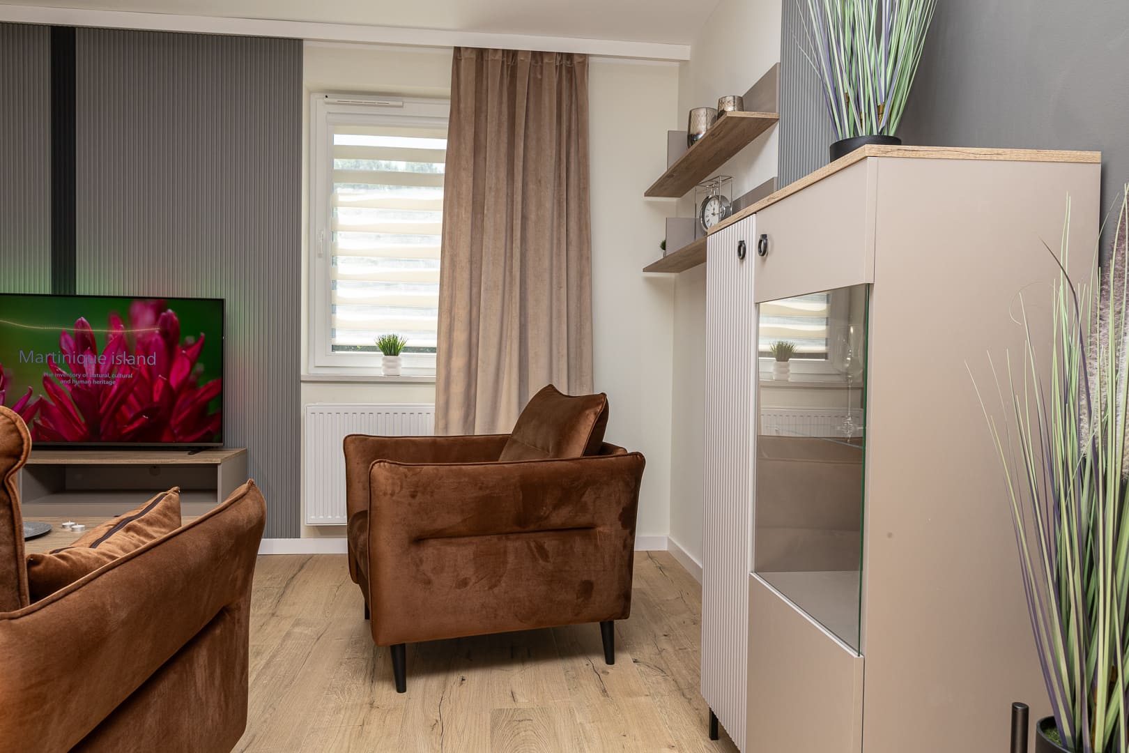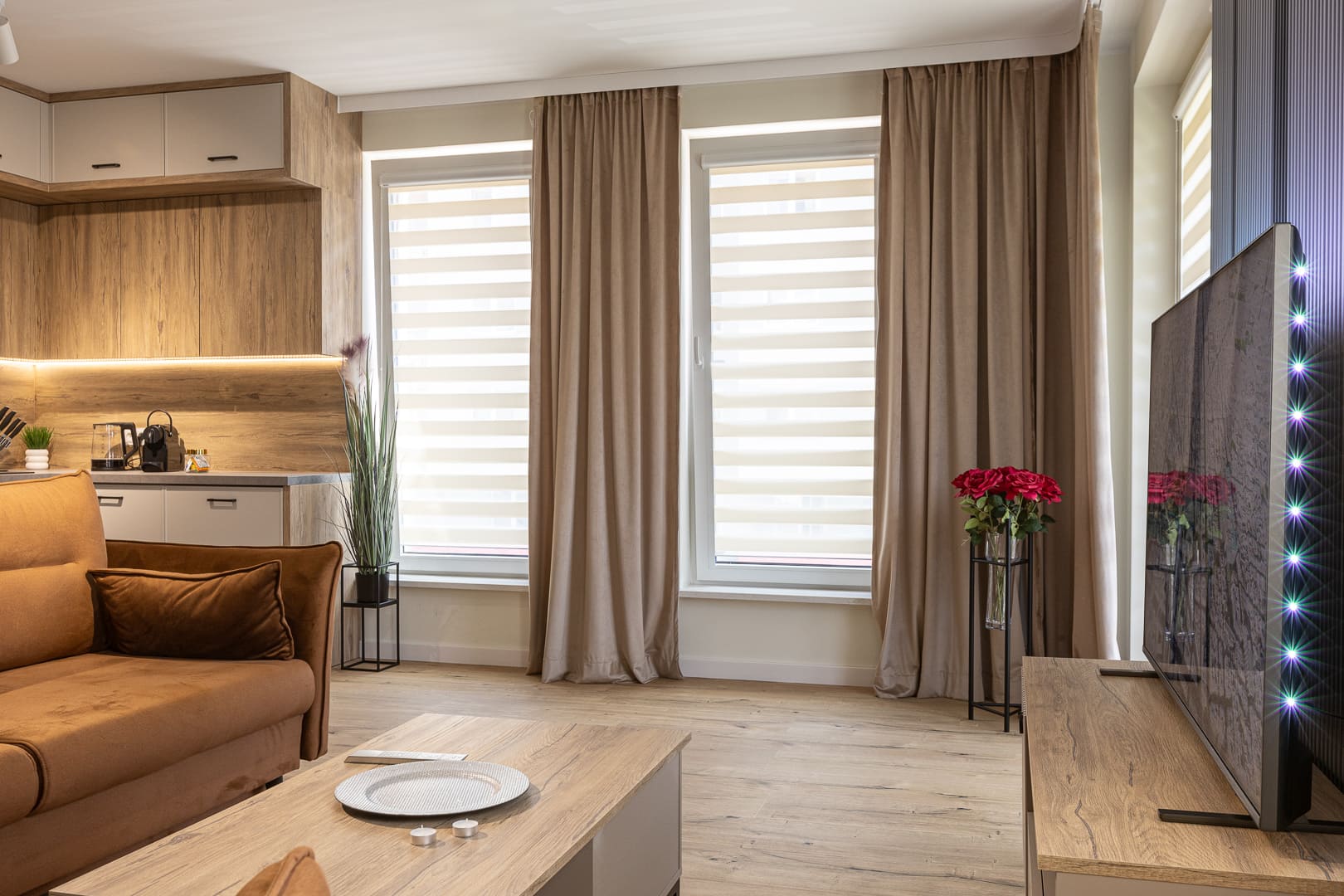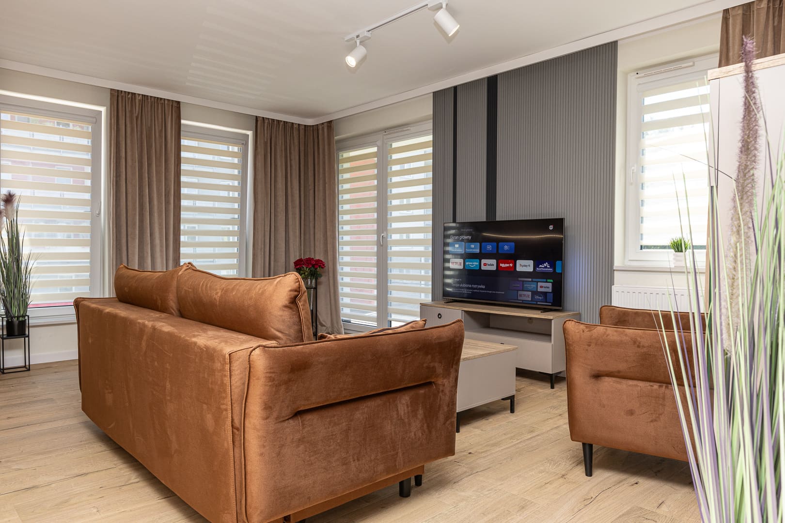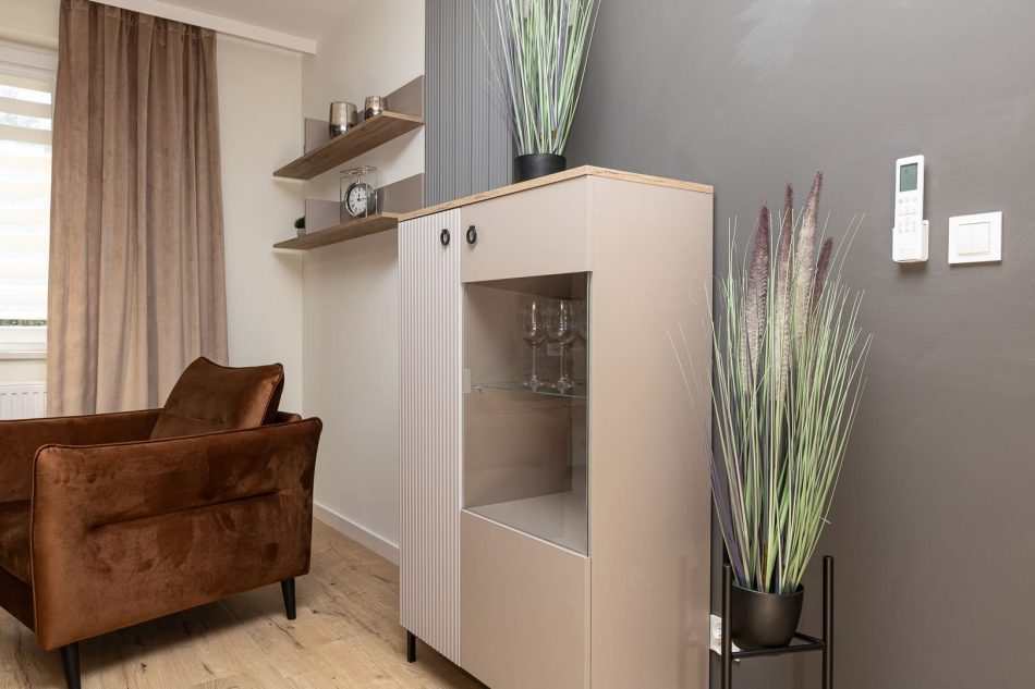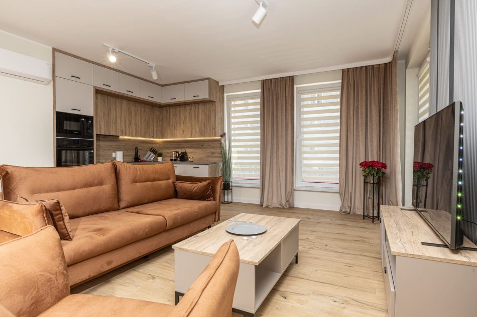 The warm and cozy interiors of this 58-square-meter apartment create a perfect atmosphere for relaxation. The first bedroom with a large double bed (160x200 cm) and the second bedroom with two single beds (90x200 cm) ensure comfort for families and groups traveling together. The living room with a sofa bed is perfect for evening relaxation, while the large balcony offers beautiful views. A comfortable bathroom with a bathtub, along with functional amenities—from a washing machine to a coffee machine—make this an ideal place for a longer stay.