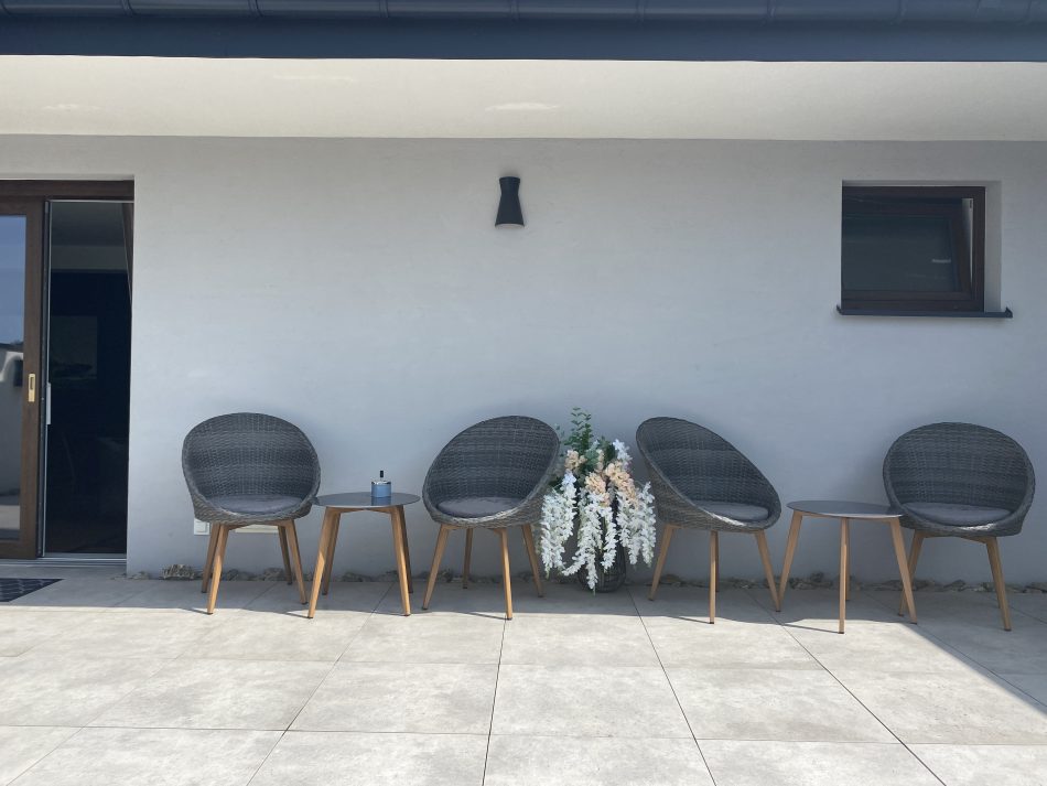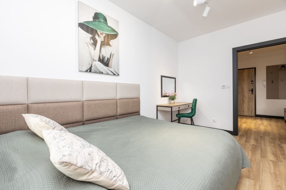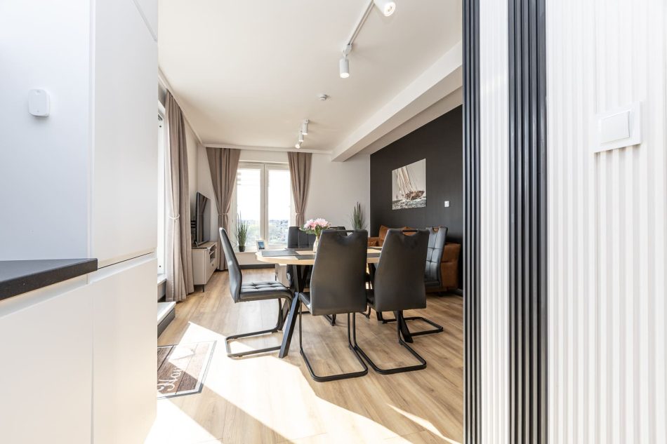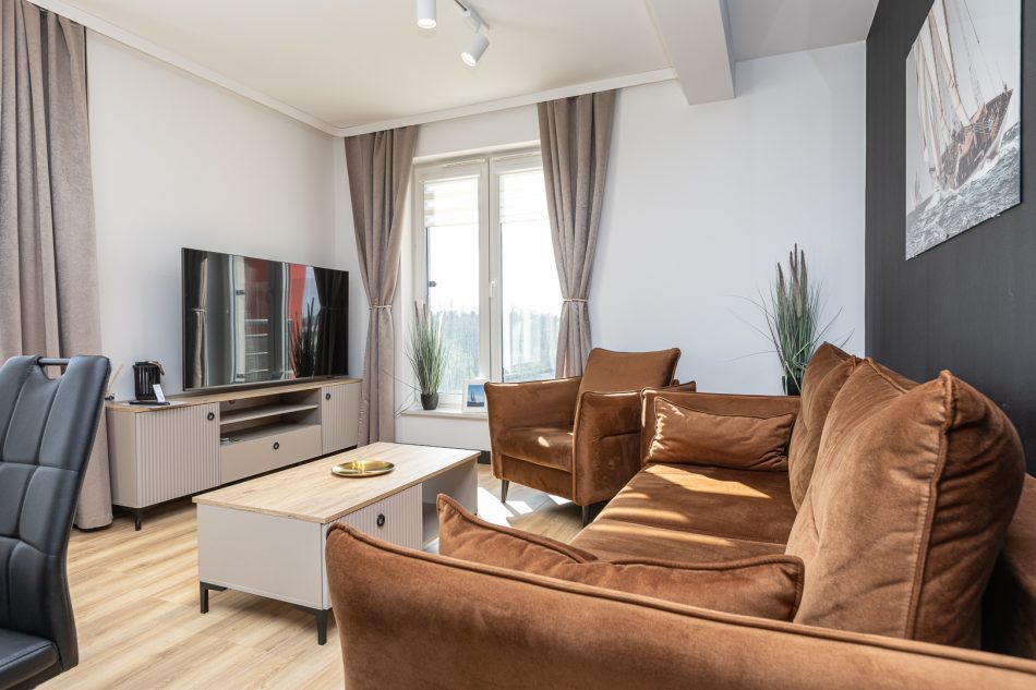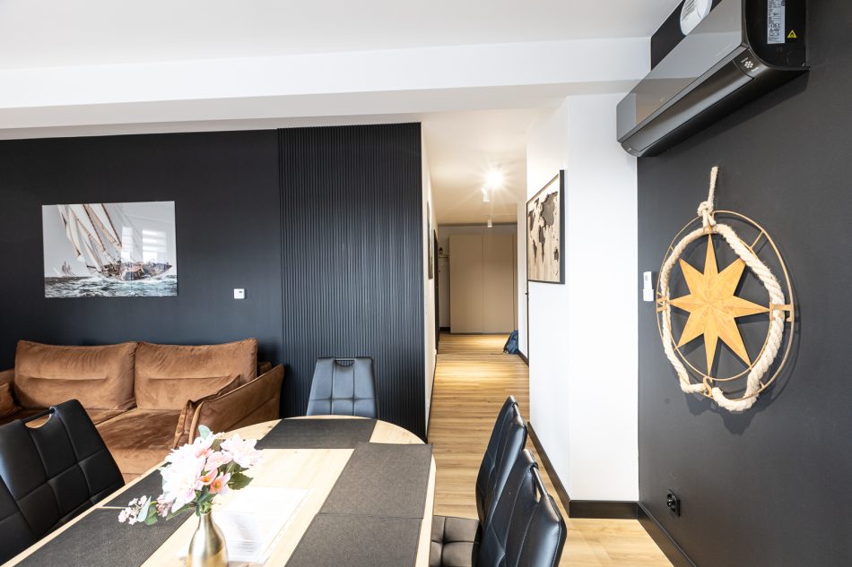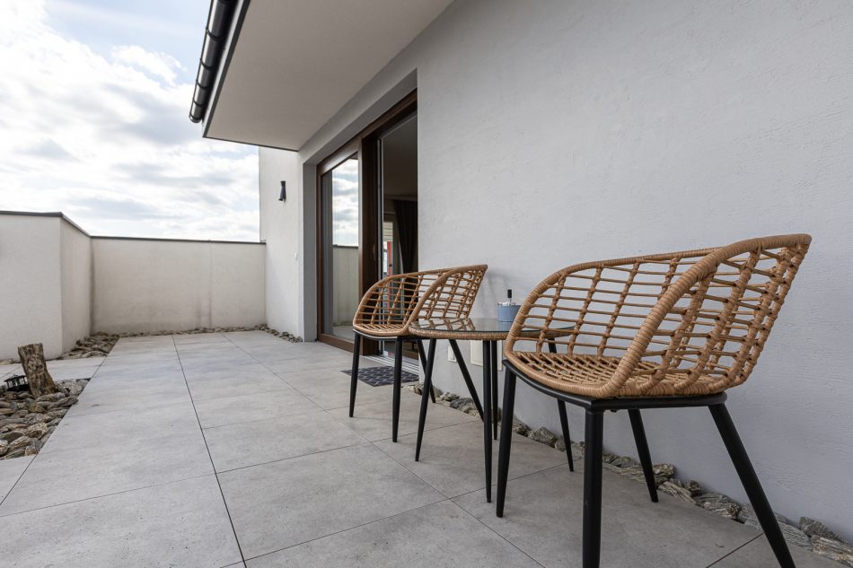 This exclusive 75 m² apartment combines spaciousness with elegance. The first bedroom features a large double bed (160x200 cm), while the second bedroom includes three single beds (90x200 cm). A comfortable living room with a sofa bed makes this an excellent option for larger groups. Two spacious bathrooms and modern amenities, including air conditioning, a clothes dryer, and a coffee machine, ensure a comfortable stay. The highlight of the apartment is the large terrace, perfect for enjoying moments of relaxation in the fresh air.